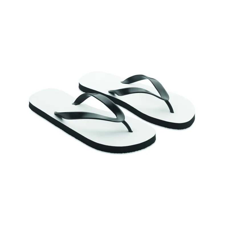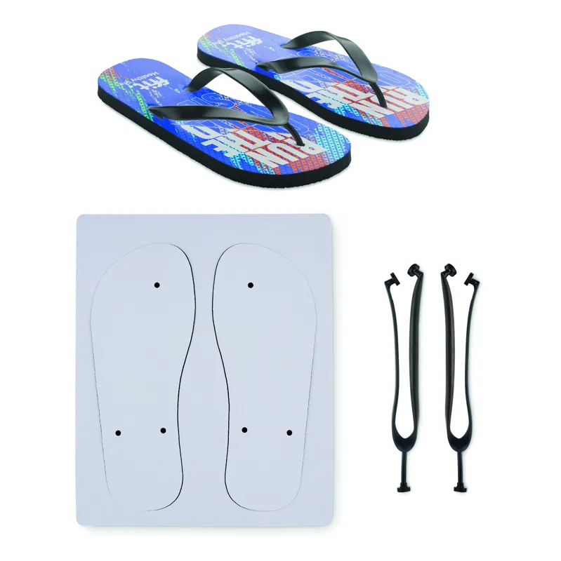 Szublimációs strandpapucs PVC pántokkal. A talp gumiból készült, a tetején poliészter bevonattal. 38-41 lábméret. A termék csak emblémázva rendelhető.