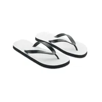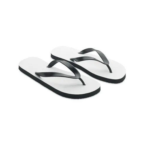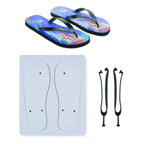 Szublimációs strandpapucs PVC pántokkal. A talp gumiból készült, a tetején poliészter bevonattal. 44-46 lábméret. A termék csak emblémázva és kompatibilis.