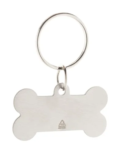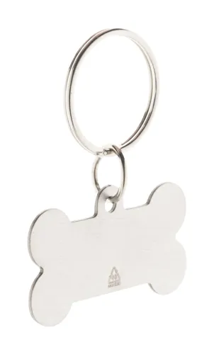 Csont alakú, újrahasznosított rozsdamentes acélból készült kutyabiléta kulcstartóval.