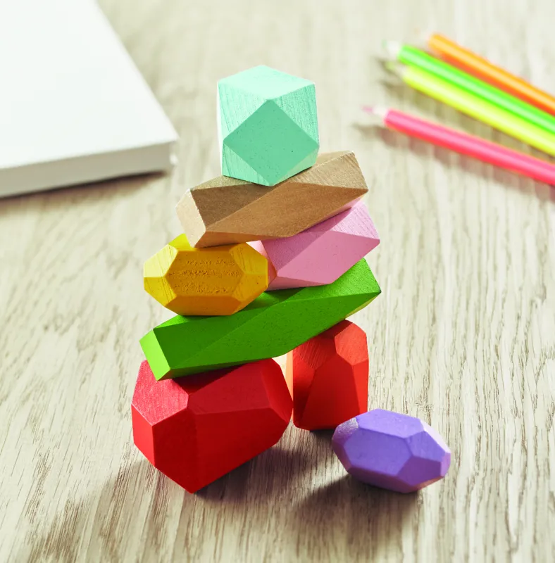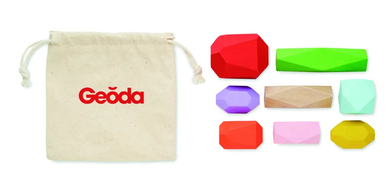 8 részes, színes, fából készült, kő formájú építőjáték, pamut húzózsinóros tárolótasakban.