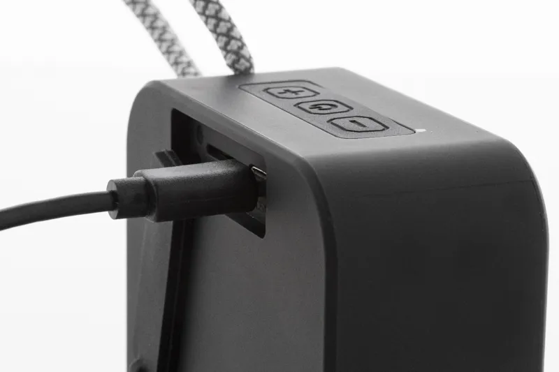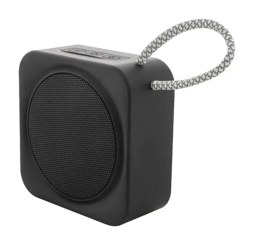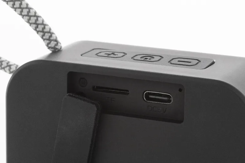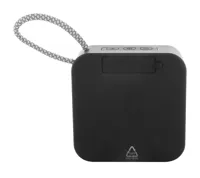 Újrahasznosított ABS műanyag vezeték nélküli hangszóró hordpánttal, fémhálóval és újratölthető akkumulátorral (300 mAh). Micro SD lejátszóval. USB töltőkábellel.