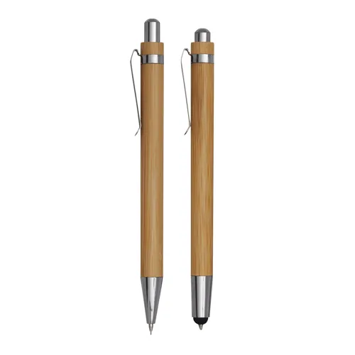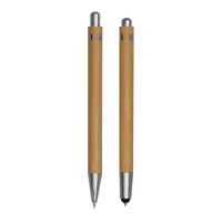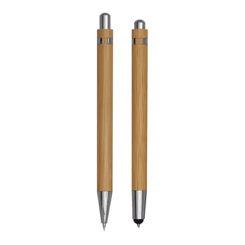DOUBLE BAMBOO toll szett: nyomógombos golyóstoll érintőképernyős véggel (kék tinta) és töltőceruza, mindkettő elegáns bambusz nyéllel, bambusz dizájnos papírdobozban