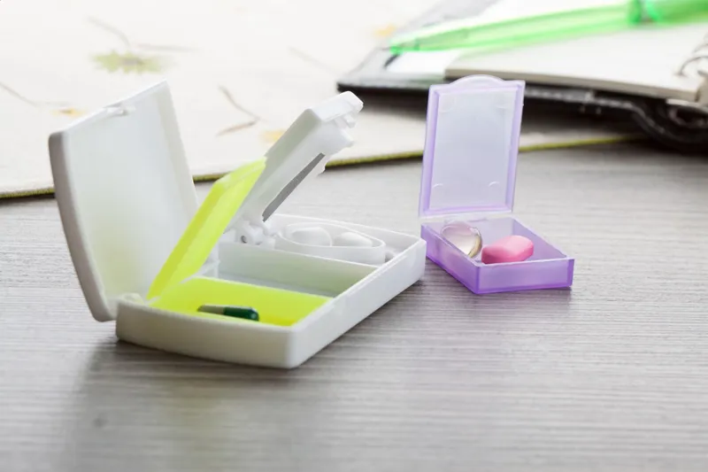 Kétrekeszes műanyag gyógyszeradagoló, gyógyszervágóval.
