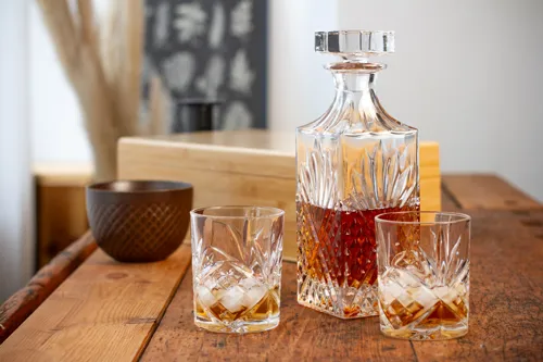 Luxus whisky szett bambusz dobozban. Egy dekantáló üveget (750 ml) és 2 whisky poharat (280 ml) tartalmaz.