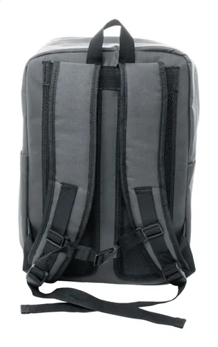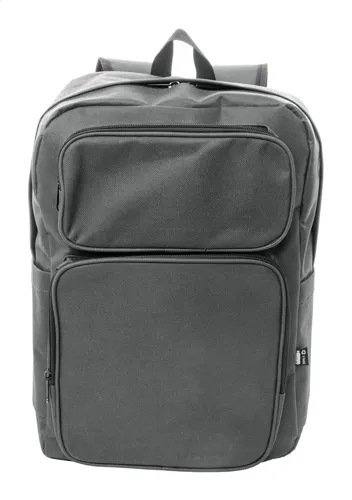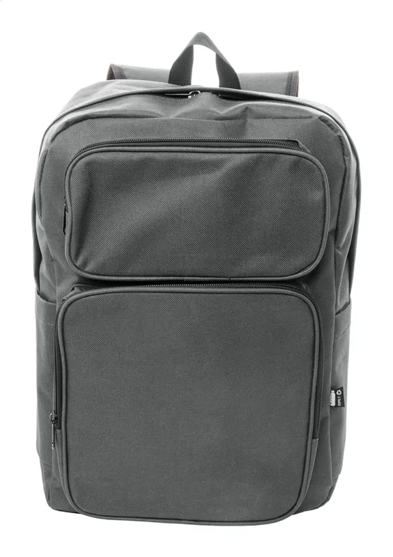 RPET hátizsák cipzáras fő rekesszel, 2 cipzáras első zsebbel, oldalzsebekkel és párnázott laptop (15") és tablet (10") rekesszel. Párnázott hát- és vállpántokkal. 600D RPET poliészter, megkülönböztető RPET címkével.