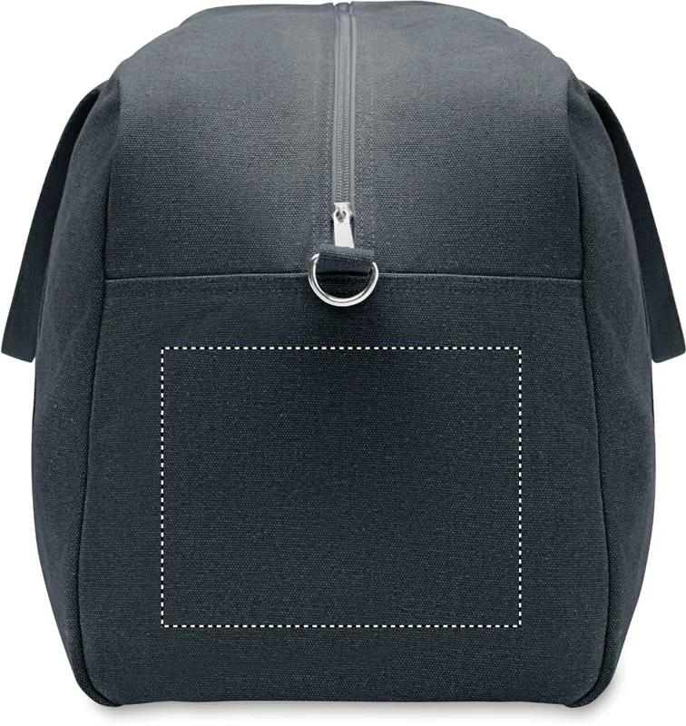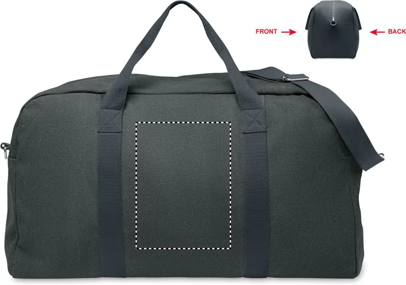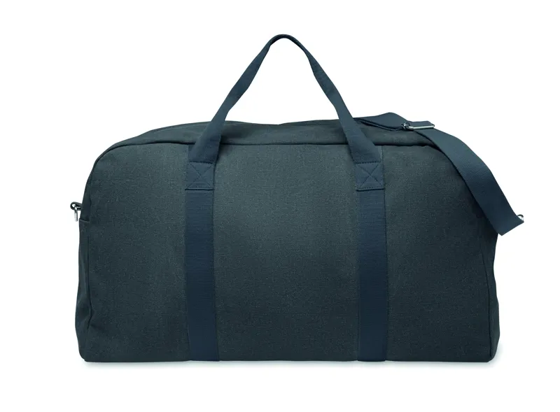 Utazótáska 450 g/m² vastag újrahasznosított anyagból (60% újrahasznosított pamut és 40% újrahasznosított poliészter), állítható és levehető pamut vállpánttal.