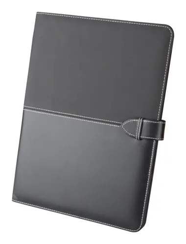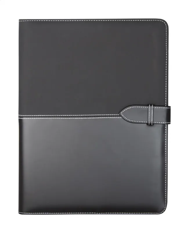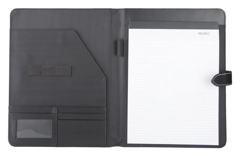 A4-es, PU bőr iratmappa 20 lapos vonalas jegyzetfüzettel, jegyzettartó, névjegytartó és tolltartó résszel. A mappa PU bőr pánttal zárható.