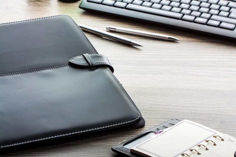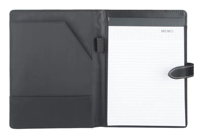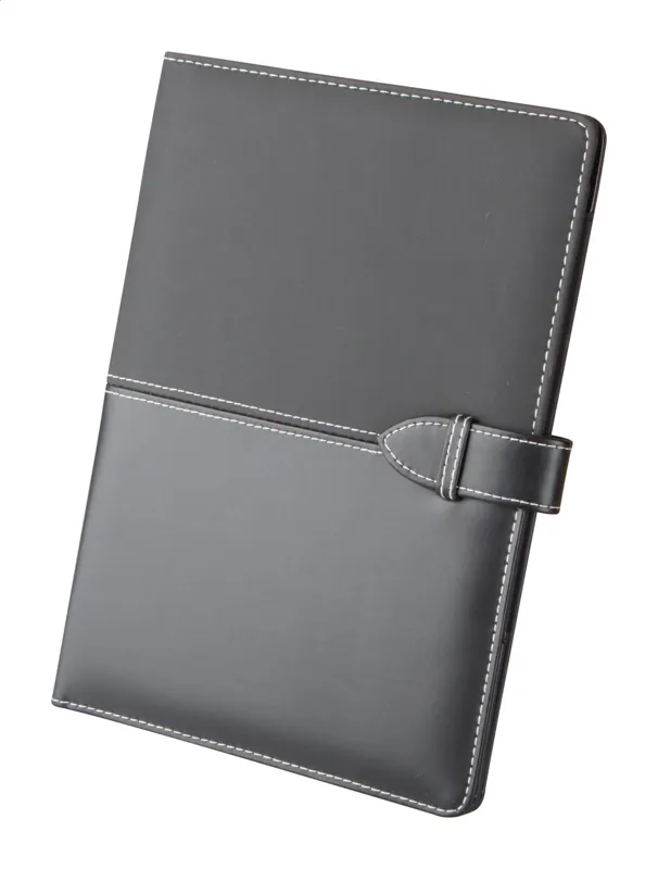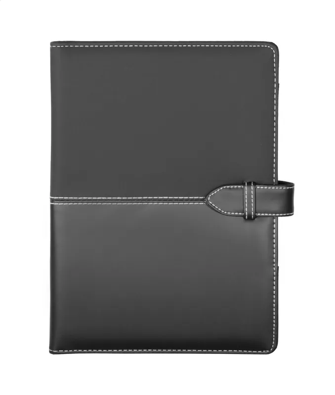 A5-ös, PU bőr iratmappa 20 lapos vonalas jegyzetfüzettel, jegyzettartó és tolltartó résszel. A mappa PU bőr pánttal zárható.