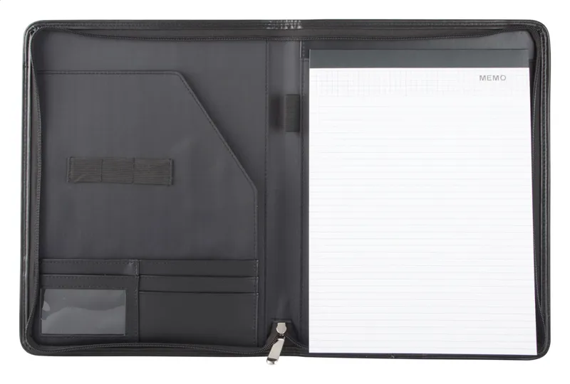 A4-es, cipzáras PU bőr iratmappa 20 lapos vonalas jegyzetfüzettel, jegyzettartó, névjegytartó és tolltartó résszel.