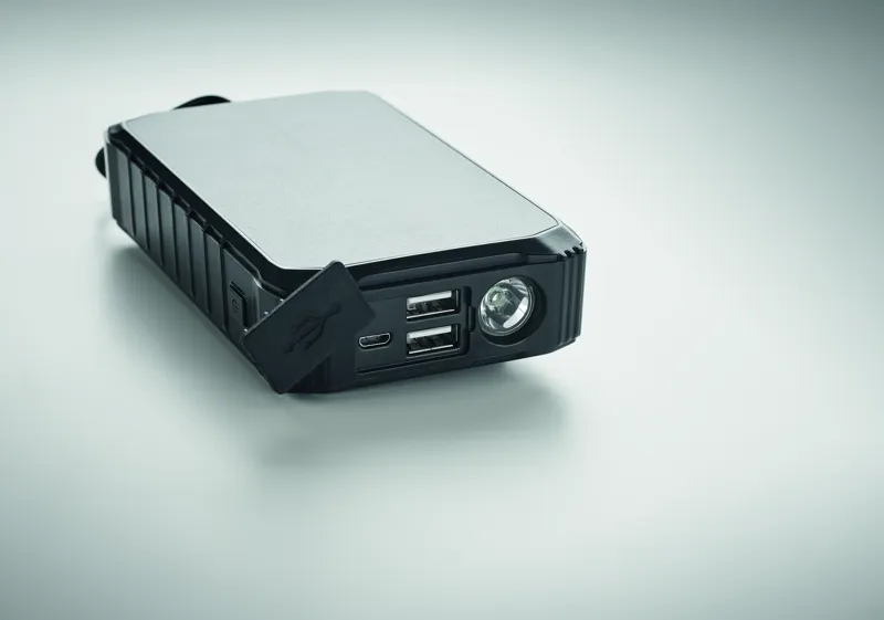 8000 mAh külső akkumulátor napelemmel és kézi hajtókarral. 100 lumenes, 1 LED-es lámpával. C-típusú be- és kimenet, 2 USB-A kimenet. Teljesítmény DC 5V/2.1A.