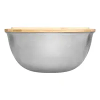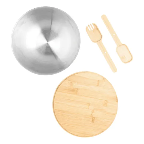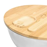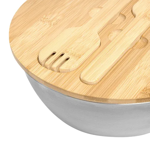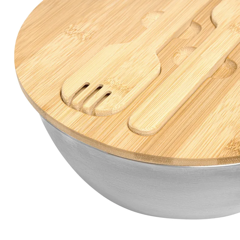 EAT HEALTHY salátás tál: nagy, rozsdamentes acél tál bambusz fedővel, beépített szervírozó kanalakkal, amelyeket mágnesek tartanak, kapacitás kb. 3 liter