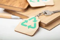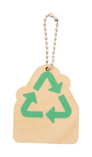 Rétegelt nyírfából készült, környezetvédelmi témájú kulcstartó fém karikával.