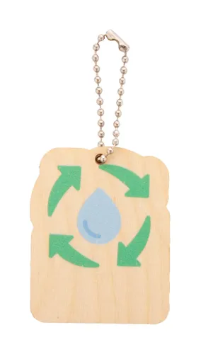 Rétegelt nyírfából készült, környezetvédelmi témájú kulcstartó fém karikával.