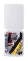 Kerékpár javító készlet PP műanyag dobozban. Egy hatszögletű csavarkulcsot és defektjavító készletet (2 köpenyleszedőt, reszelőt, ragasztót, 2 szelepsapkát, 2 szelepcsövet és 5 tapaszt) tartalmaz.