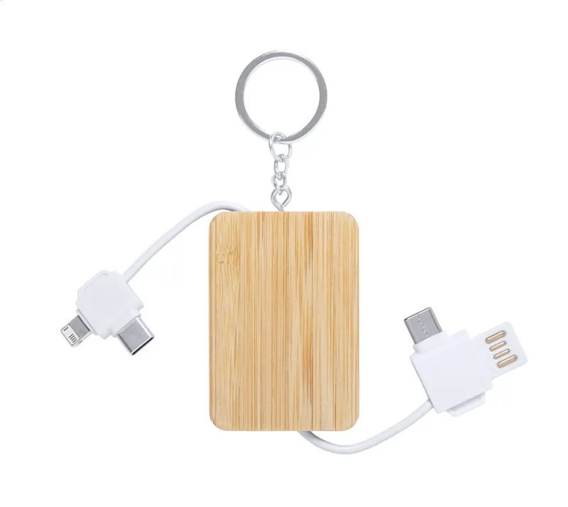 Bambusz kulcstartó és USB töltőkábel, micro USB, USB-C és Lightning csatlakozókkal. USB és USB-C bemenettel.