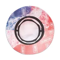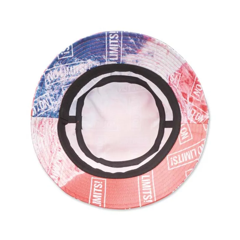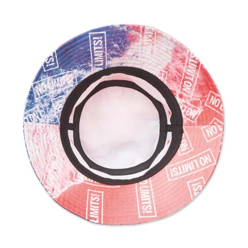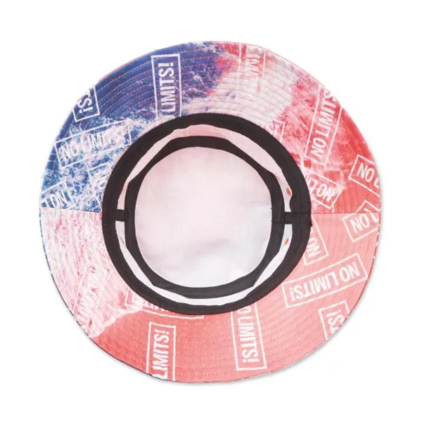 4 szín kolor horgász kalap 260 g/m² vastag fehér poliészterből, az Ön dizájnjával nyomtatva a külső oldal teljes felületén és az 5,5 vagy 7,5 cm-es karima belső oldalán. Az izzadságfelszívó pánt fekete poliészterből készült.