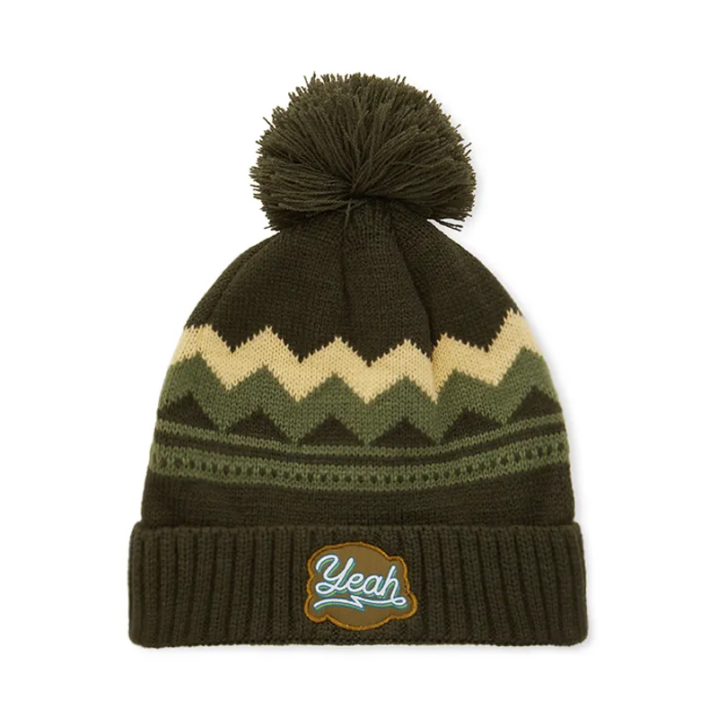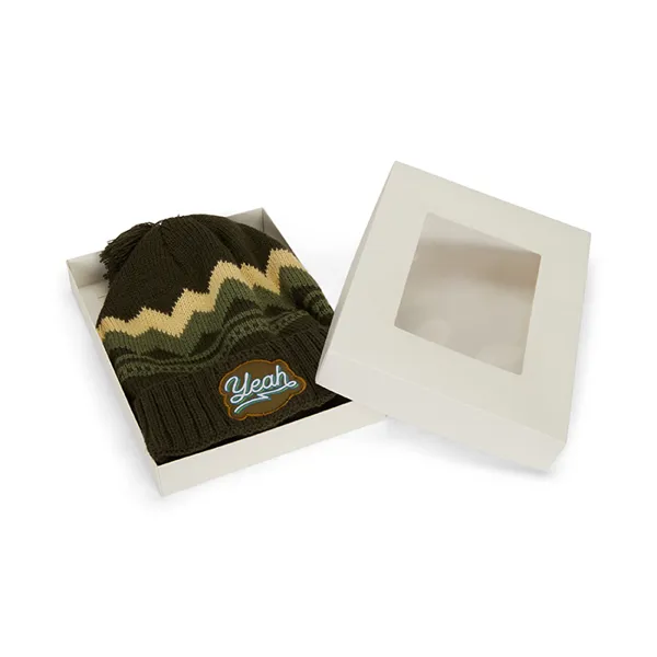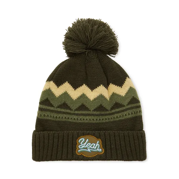 Egyedi mintás, akril kötött sapka 2x1 bordás mandzsettával és pomponnal.
