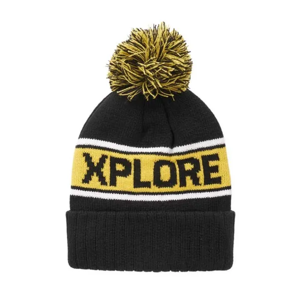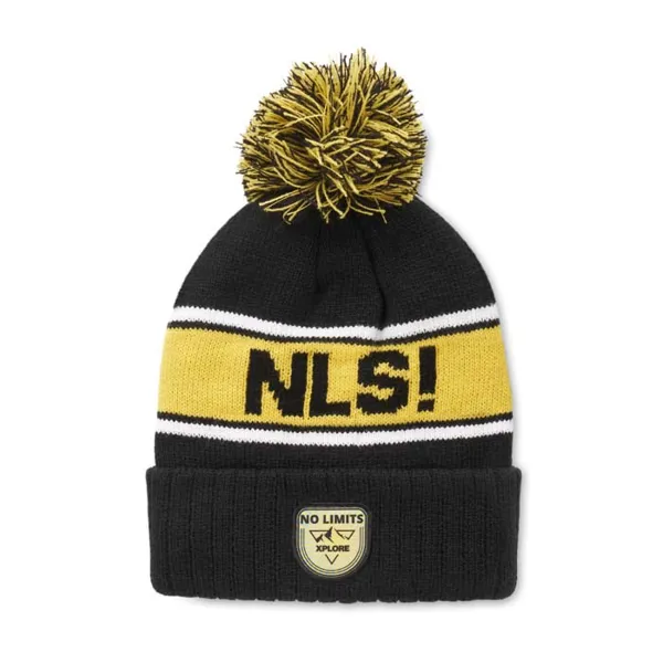 Egyedi mintás, RPET jacquard kötött sapka 3x1 bordás mandzsettával és pomponnal.