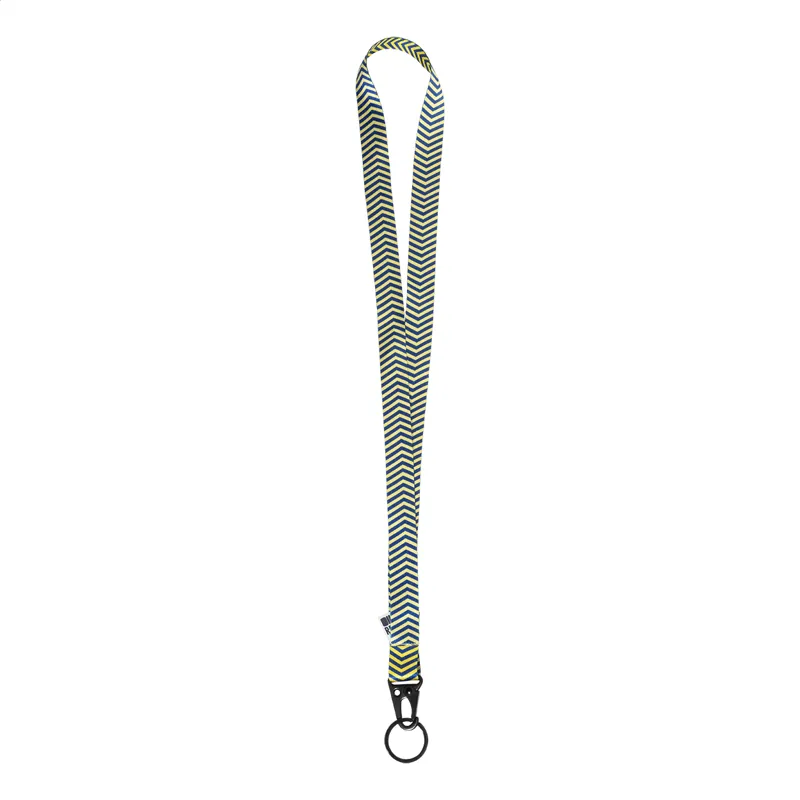Egyedi gyártású, RPET anyagból készült nyakpánt fekete fém taktikai stílusú karabinerrel és kulcstartóval. Mindkét oldalon szublimációs nyomtatott grafikával. Minimális rendelési mennyiség: 100 db.