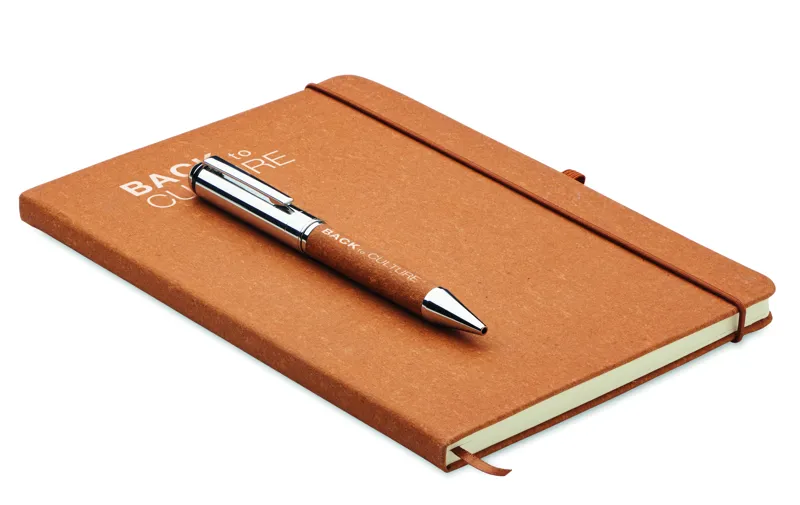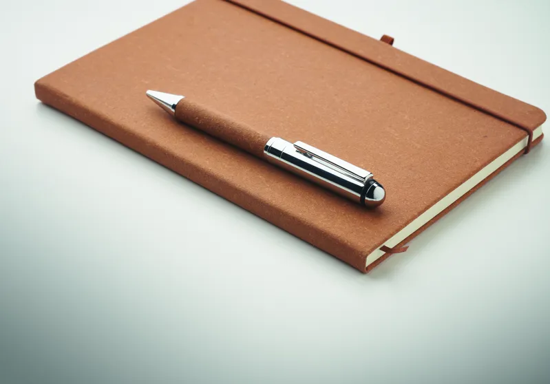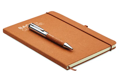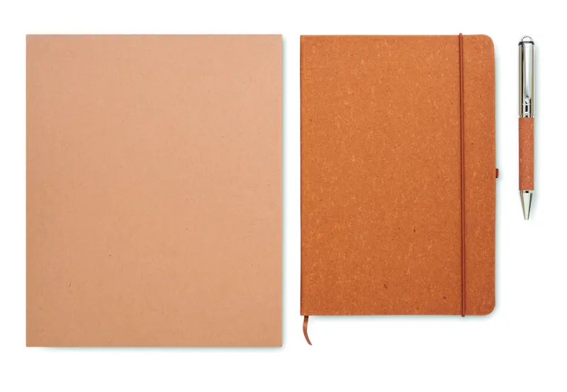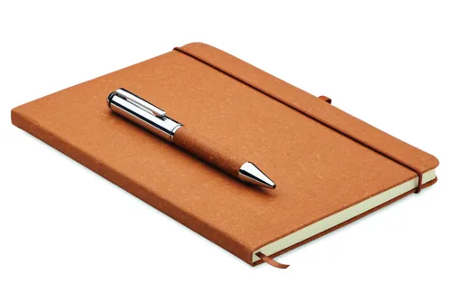 Ajándékszett. A5 jegyzetfüzet 75%-ban újrahasznosított bőrből készült keménytáblás borítóval. Cérnafűzött. 160, újrahasznosított papírból készült, vonalas oldal (80 lap). Egyező színű elasztikus zárópánt, tolltartó hurok és könyvjelző szalag. Egyező színű csavarmechanikás fém golyóstoll. Kéken író betéttel. Kraftpapír dobozban. FSC®-certified | FSC MIX CREDIT, P7.1, FSC-C213206