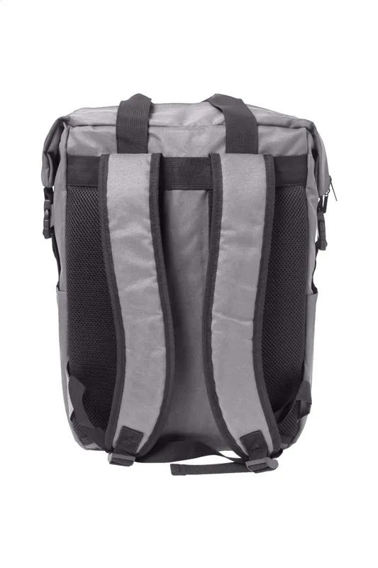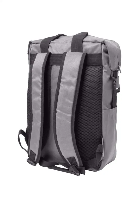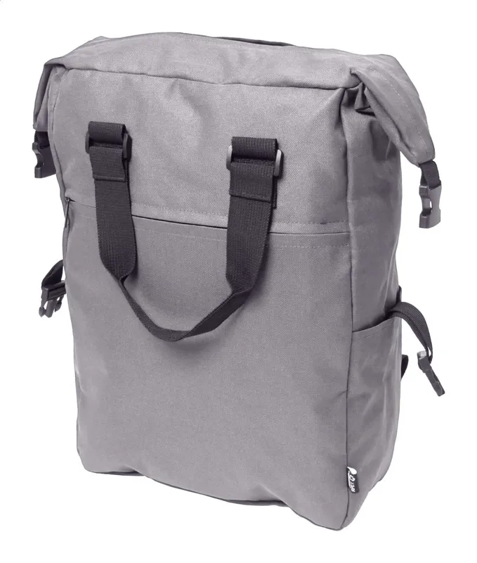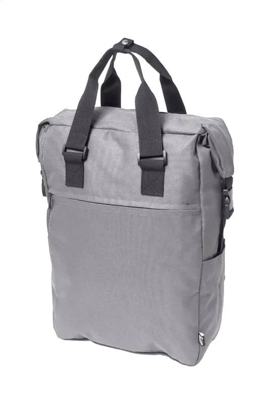 RPET hátizsák cipzáras fő rekesszel és első zsebbel, párnázott laptop (15") és tablet (10") rekesszel, oldalsó csatos pántokkal és zsebekkel, párnázott hát- és vállpántokkal. 600D RPET poliészter, megkülönböztető RPET címkével.