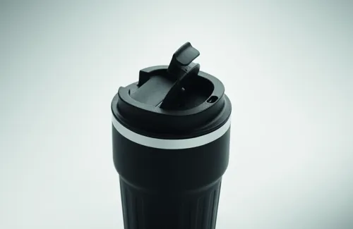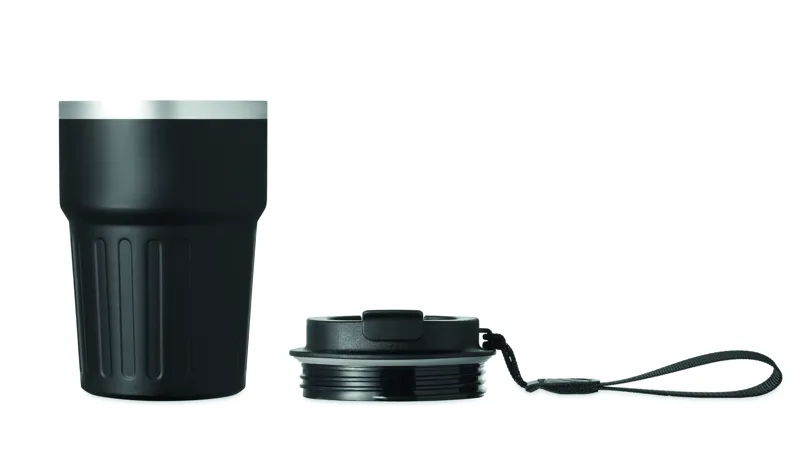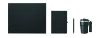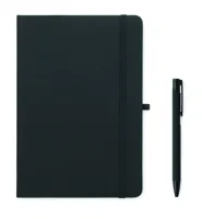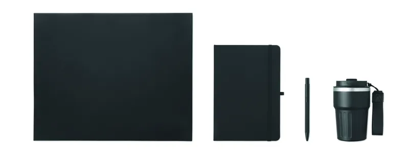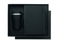 A5 jegyzetfüzet, újrahasznosított alumínium golyóstoll és 350 ml-es duplafalú, újrahasznosított rozsdamentes acél pohár PP, ivónyílásos fedéllel, pánttal, díszdobozban.