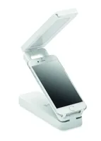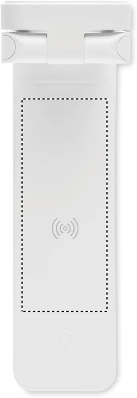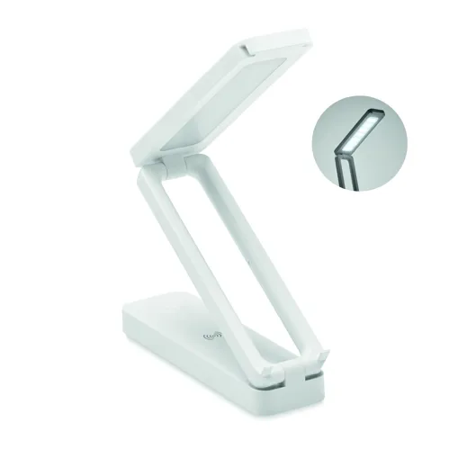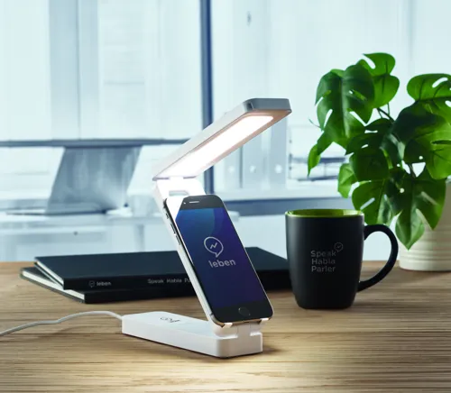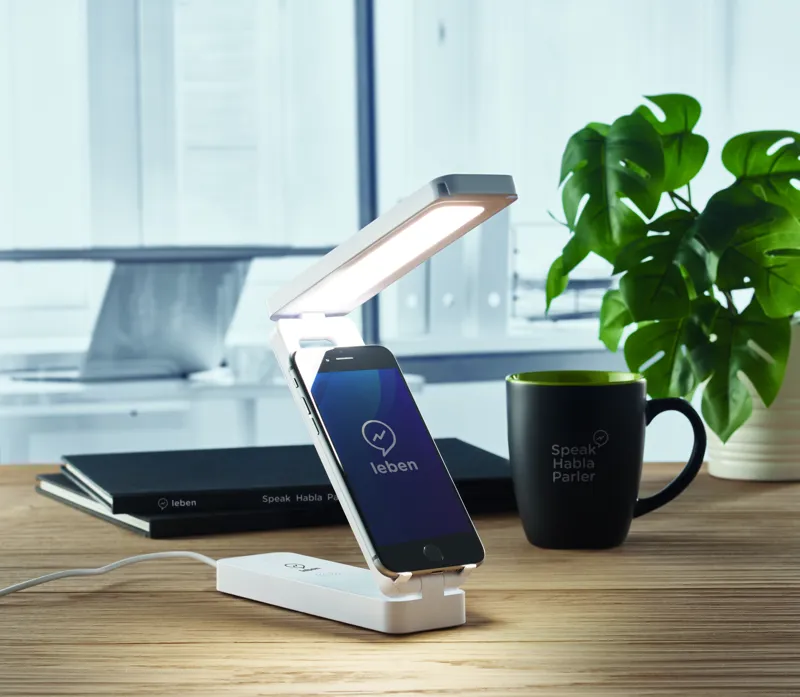 Összecsukható, 10W-os asztali vezeték nélküli töltő lámpával, ABS-ből. Lámpa 14 LED-del, 3 állítható fényerőséggel. Teljesítmény: DC 9V/1,1A (10W) a gyorstöltéshez. Qi készülékekhez (újabb Android, iPhone® 8, X, stb.).