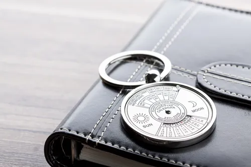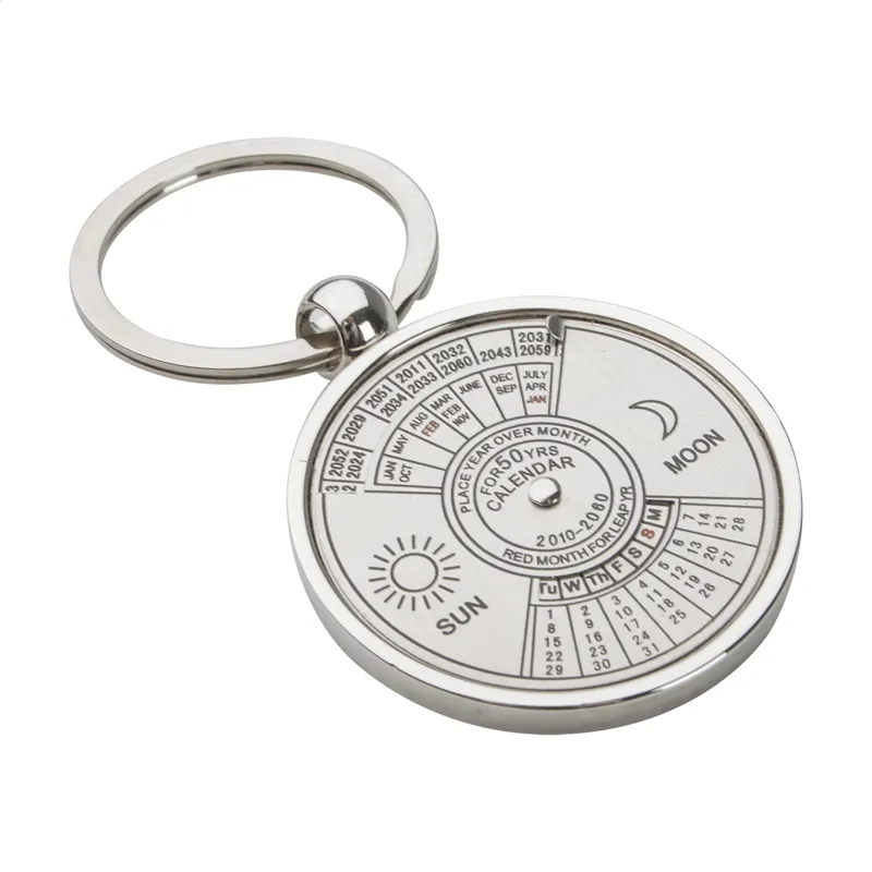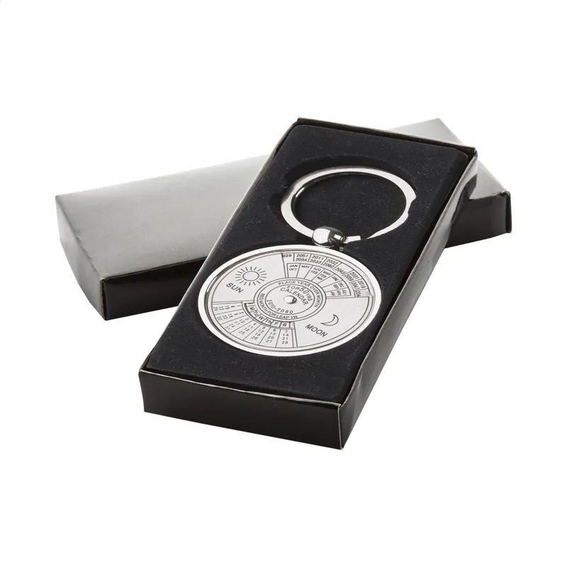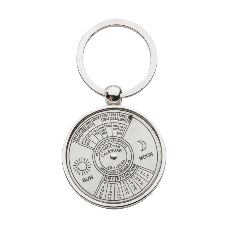 Fém kulcstartó kerek, forgatható öröknaptárral 2060-ig. Fekete kartondobozban szállítjuk.