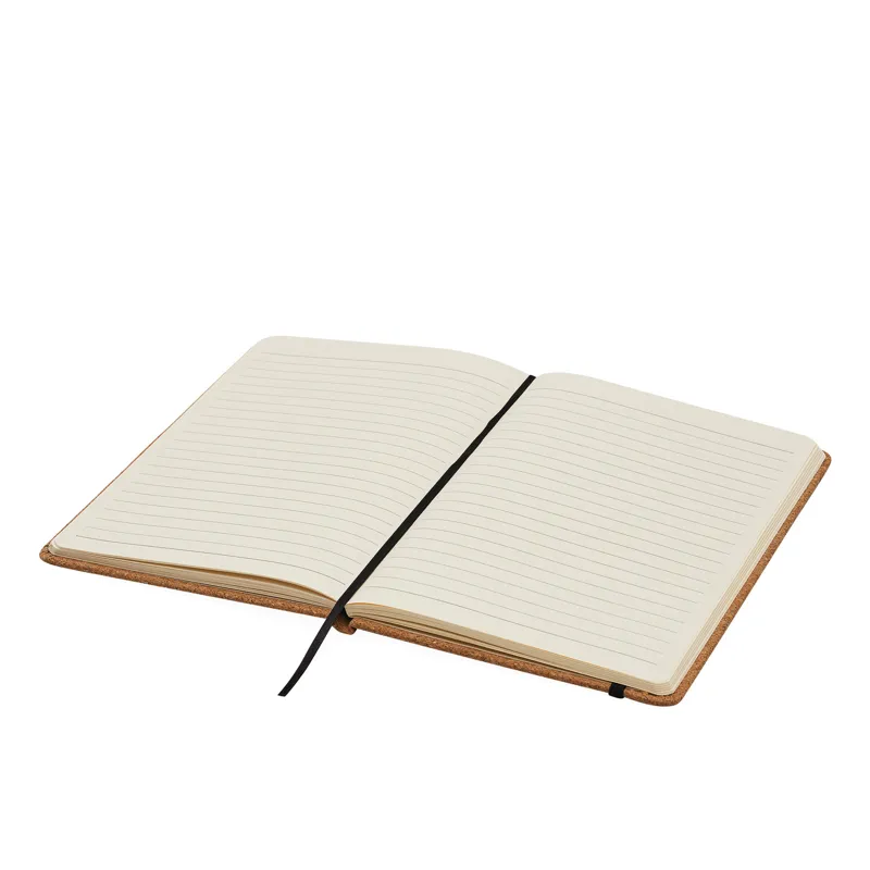 EXECUTIVE jegyzetfüzet DIN A5-ös méret lekerekített szélekkel: gumipánttal a lezáráshoz, beépített könyvjelzővel, 80 lapos, vonalas, 70 g/m² - parafa borítóval