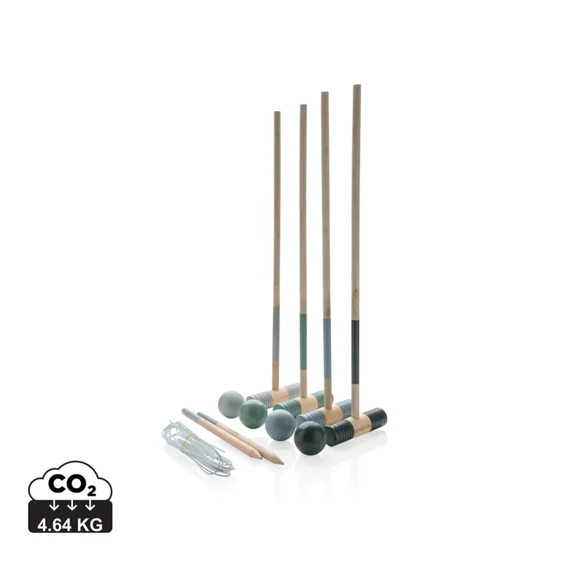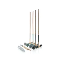 Gyönyörű, 4 játékos számára készült fa krokett készlet, amely 4 krokett kalapácsot, 4 golyót és 10 fém karikát tartalmaz. Egyszerűen helyezze a karikákat a kívánt pozícióba és alakítson két csapatot. Az egyik csapat 2 kijelölt golyóval játszik, a másik pedig a másik 2-vel. Ha az egyik csapatnak sikerül a karikán átütnie a labdát, újabbat üthet. Ha nem: a másik csapaton a sor. A győztes az a csapat, akinek mindkét golyót sikerül minden karikán átütnie. A kalapácsfej és a golyók fenyőfából készülnek, a fogantyú és a bábuk pedig eukaliptusz fából. Pamut tasakban, játékszabállyal.