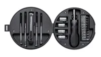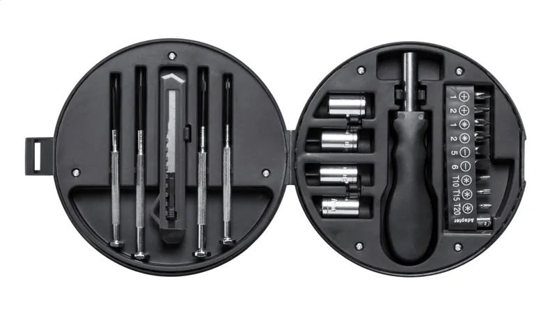 20 részes szerszámkészlet autókerék alakú műanyag tokban.