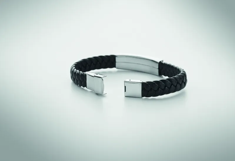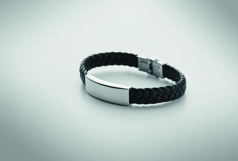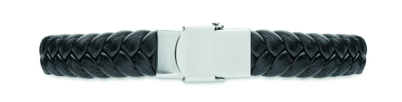 Fonott műbőr karkötő, polírozott acél részletekkel. Csukló körméret: 21 cm.