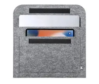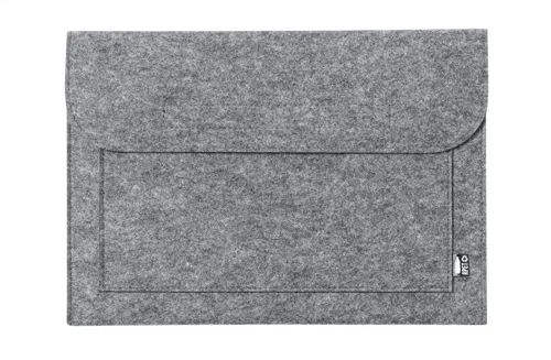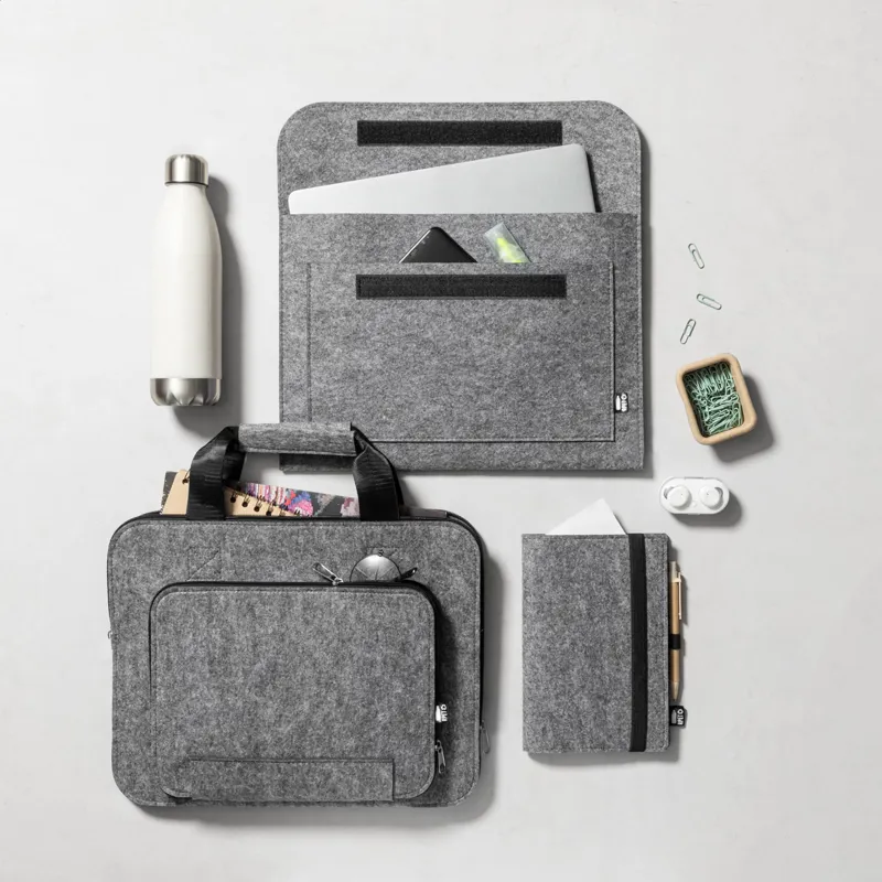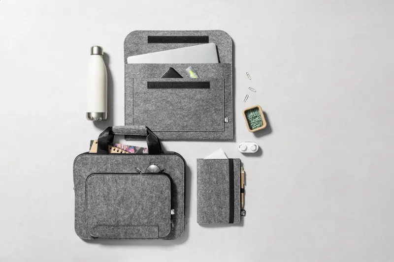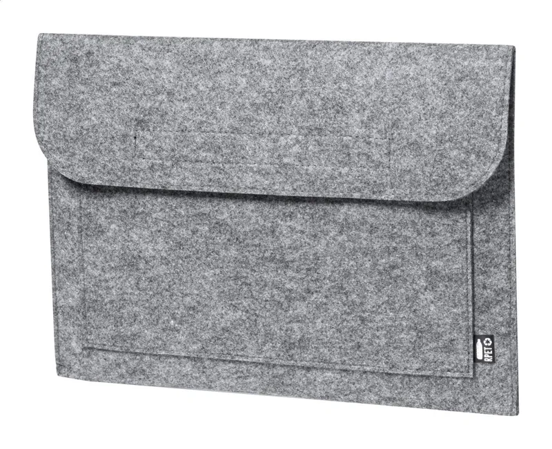 RPET filc laptoptáska elülső zsebbel és tépőzárral. Jellegzetes RPET címkével.
