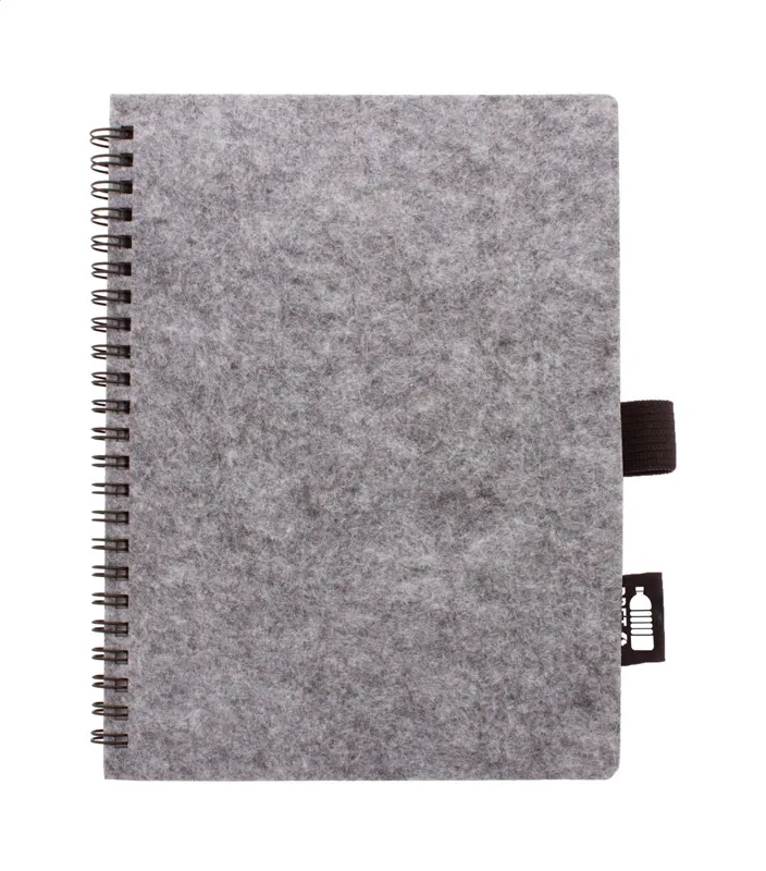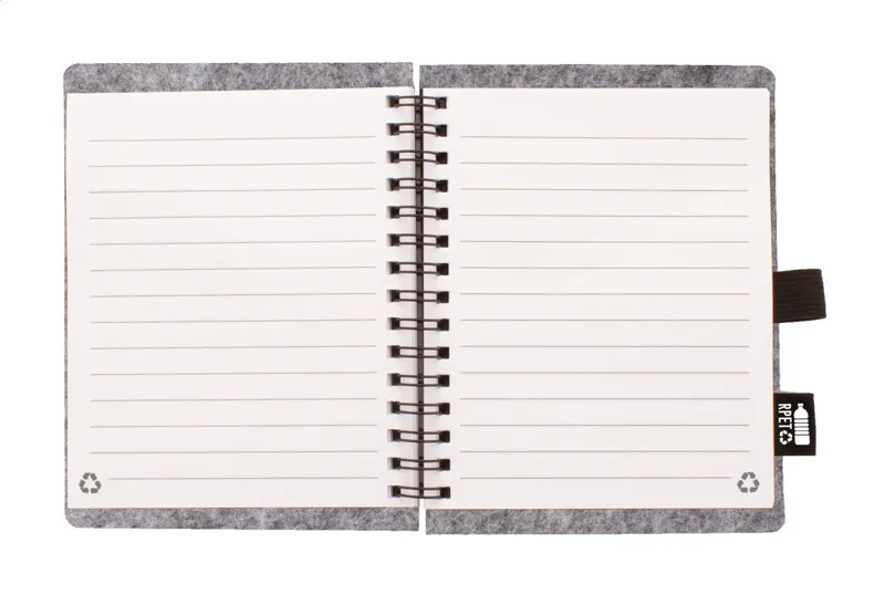 RPET filc borítású spirál jegyzetfüzet, megkülönböztető RPET címkével és 80, újrahasznosított papírból készült vonalas lappal. A6 méretű.