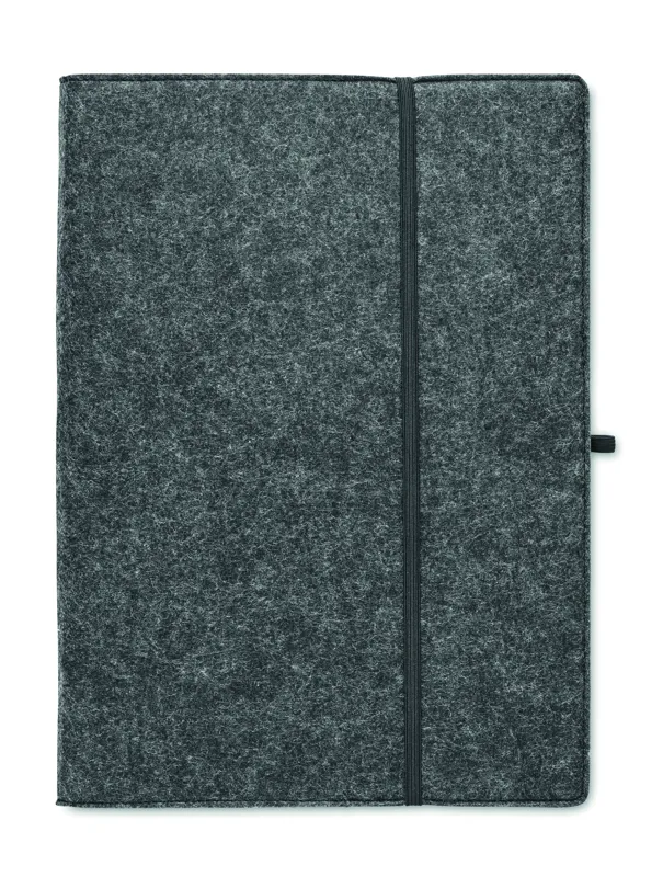 A4 konferencia mappa RPET filcből. 100 lapos, vonalas, újrahasznosított papírból készült jegyzettömbbel, rugalmas tolltartó hurokkal.