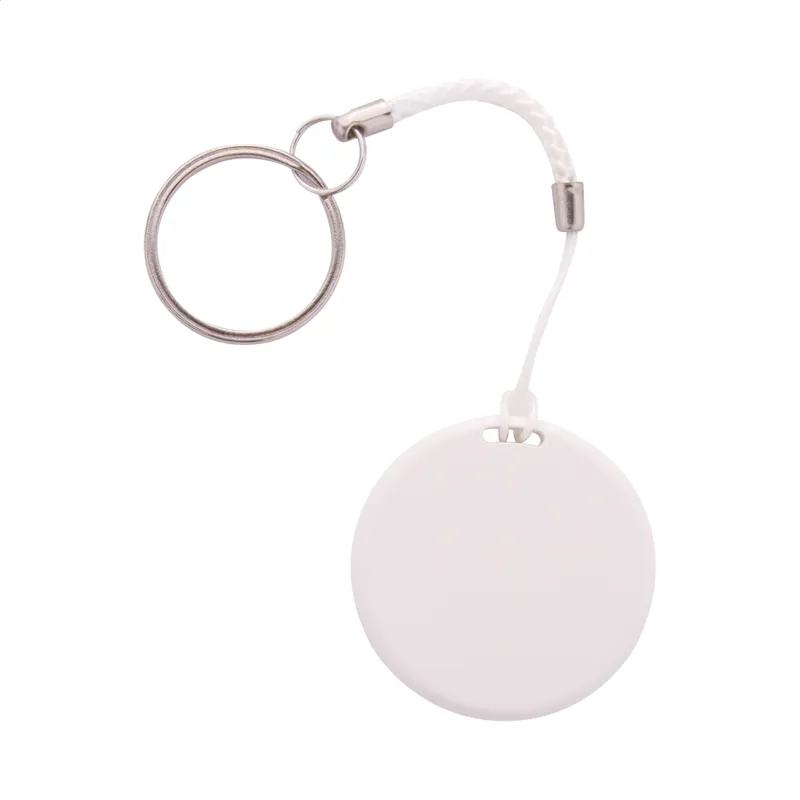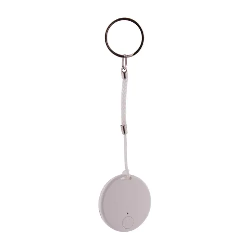 Kulcskereső eszköz vezeték nélküli kapcsolattal, kamera exponáló funkcióval, kör alakú műanyag borításban. Zsinórral és fém karikával. Gombelemmel szállítjuk. Ingyenes iOS / Android applikációval működik.