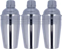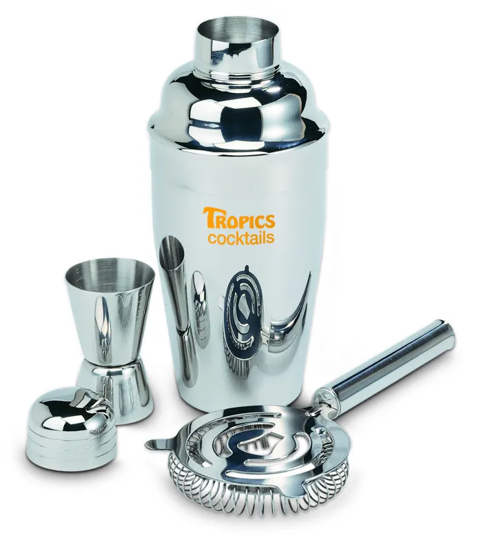 Rozsdamentes acél koktél készlet 500 ml-es shakerrel, mérőedénnyel és szűrővel.