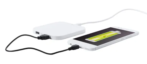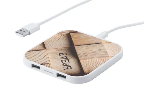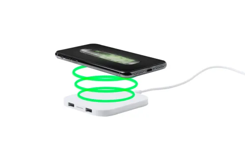 Műanyag vezeték nélküli töltő (10W) 2 USB csatlakozóval. Max. kimenet: 2100 mA. USB töltőkábellel szállítjuk.