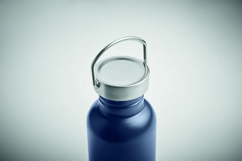 Szimplafalú palack újrahasznosított rozsdamentes acélból (90% újrahasznosított rozsdamentes acél és 10% rozsdamentes acél), fedéllel és fogantyúval. Szivárgásmentes. Űrtartalom: 500 ml. Mivel ez egy szimplafalú bögre, hőátadás lehetséges.