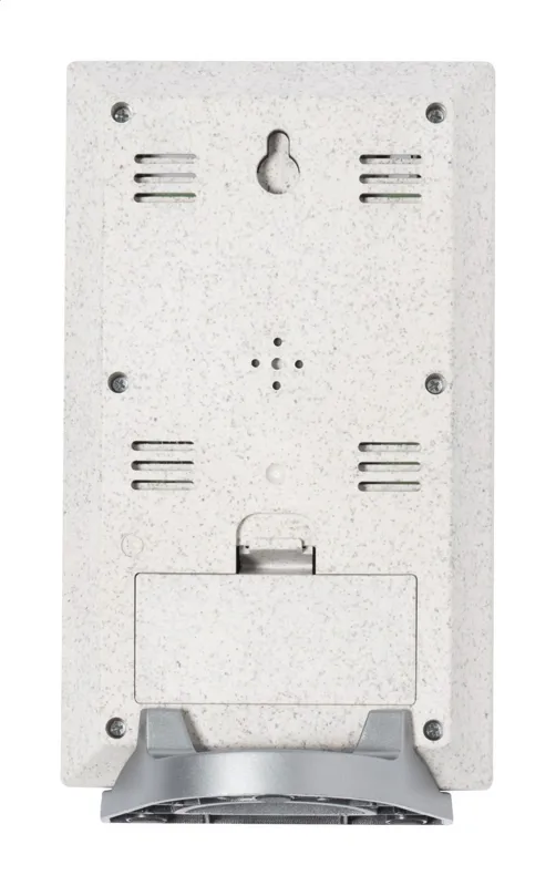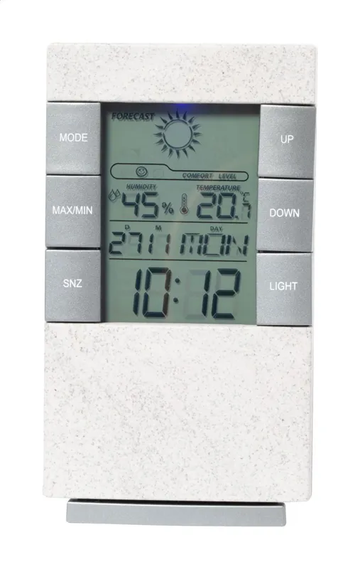 Ökológiai búzaszalma műanyag digitális óra és időjárás állomás hőmérővel és páratartalom kijelzővel. 2 db AAA elemmel működik, elem nélkül szállítjuk.