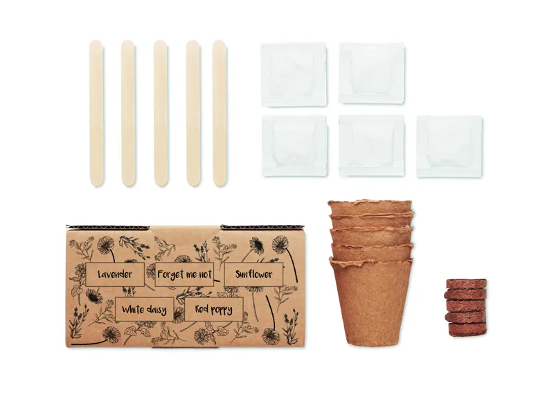 Virágtermesztő készlet. Levendula, nefelejcs, napraforgó (Helianthus debilis), százszorszép és pipacs magokat tartalmazó doboz. EU-ban gyártva. Ültetőközeg koronggal szállítjuk.
