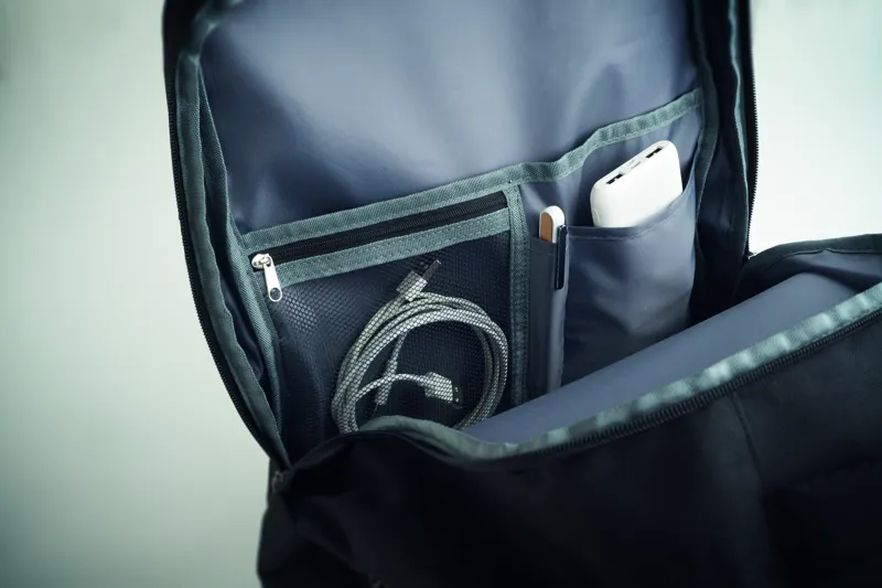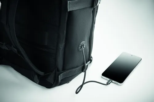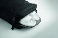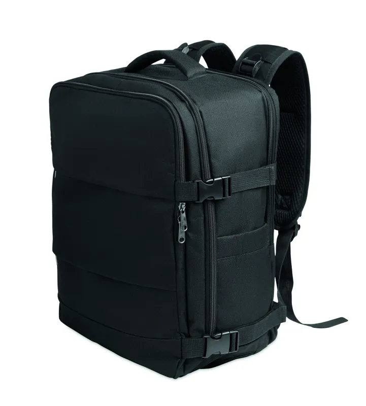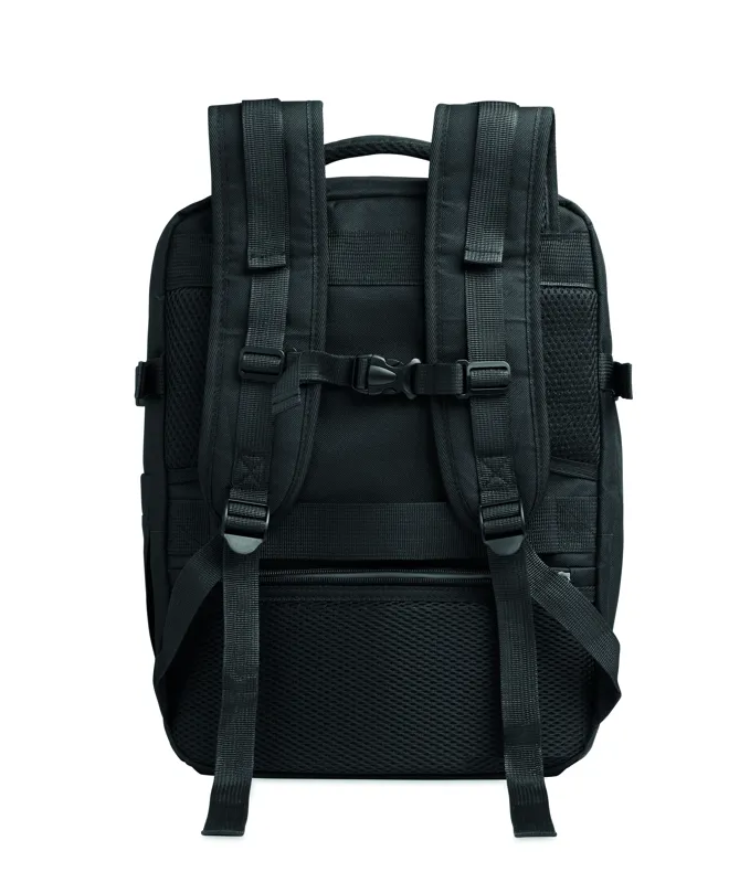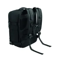 Kabinméretű, bővíthető hátizsák 600D RPET poliészterből, PU hátoldallal és 180°-os nyitással. Cipőtartóval, párnázott 15 colos laptop rekesszel, hálós pántokkal, bőröndpánttal és oldalsó csatokkal.