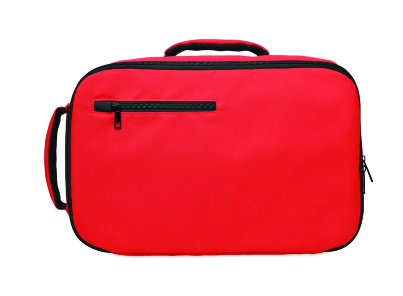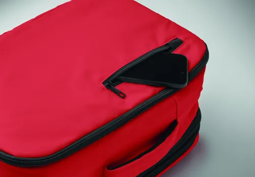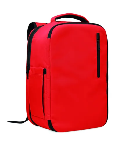 Kabinméretű, bővíthető hátizsák 600D RPET poliészterből, 180°-os nyitással. Fő rekesszel, két nyitott résszel, hálós elválasztóval, párnázott 15 colos laptop rekesszel és bőröndpánttal.