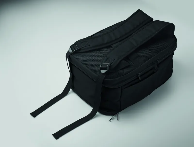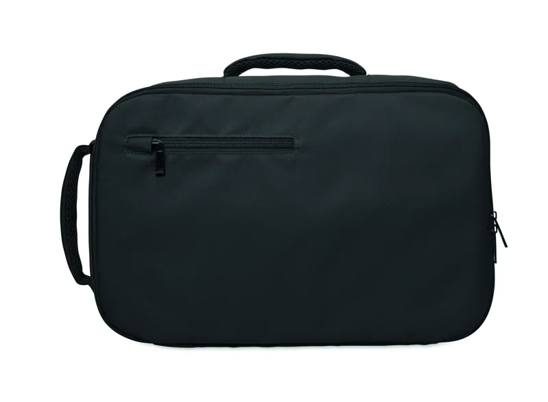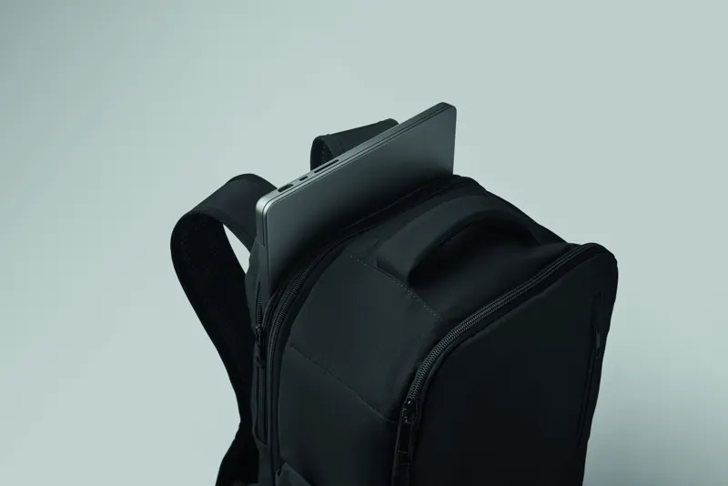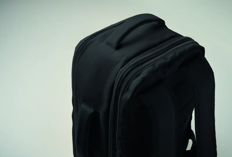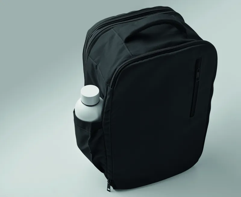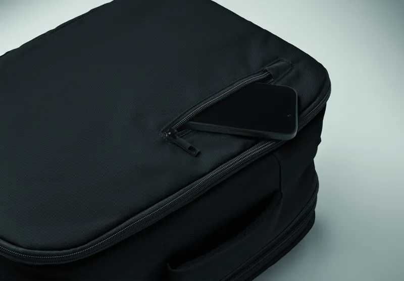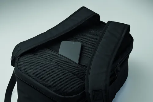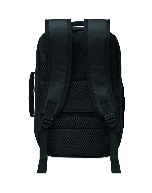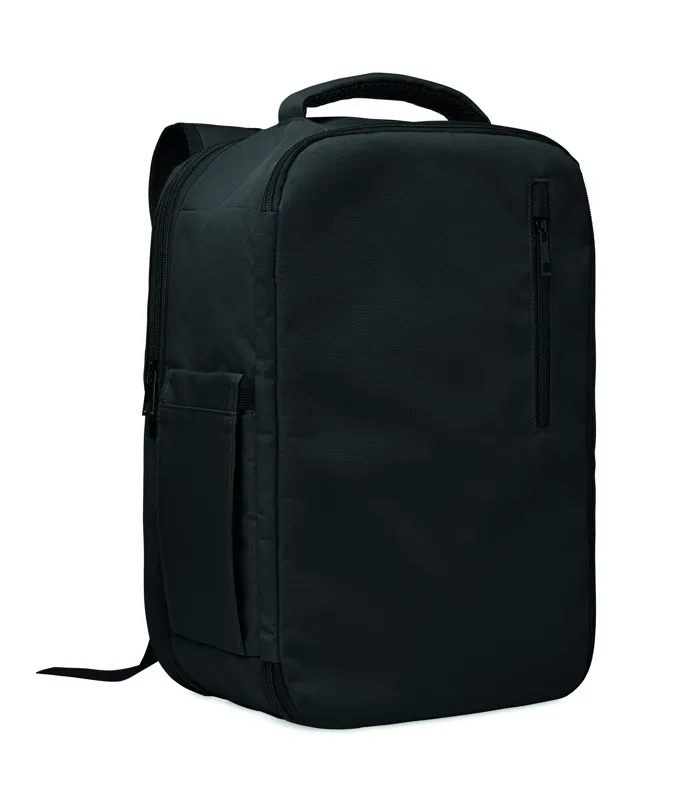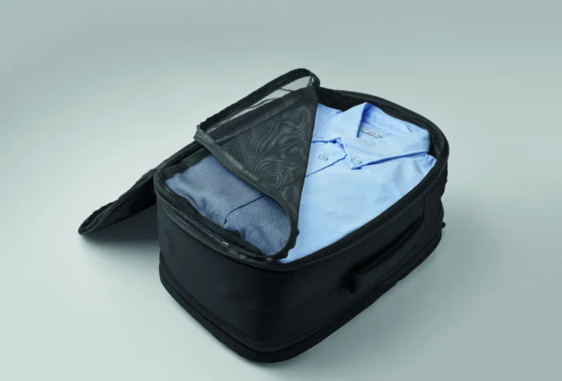 Kabinméretű, bővíthető hátizsák 600D RPET poliészterből, 180°-os nyitással. Fő rekesszel, két nyitott résszel, hálós elválasztóval, párnázott 15 colos laptop rekesszel és bőröndpánttal.