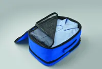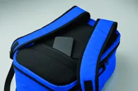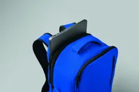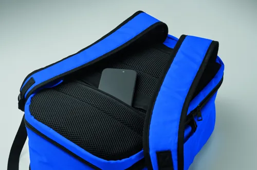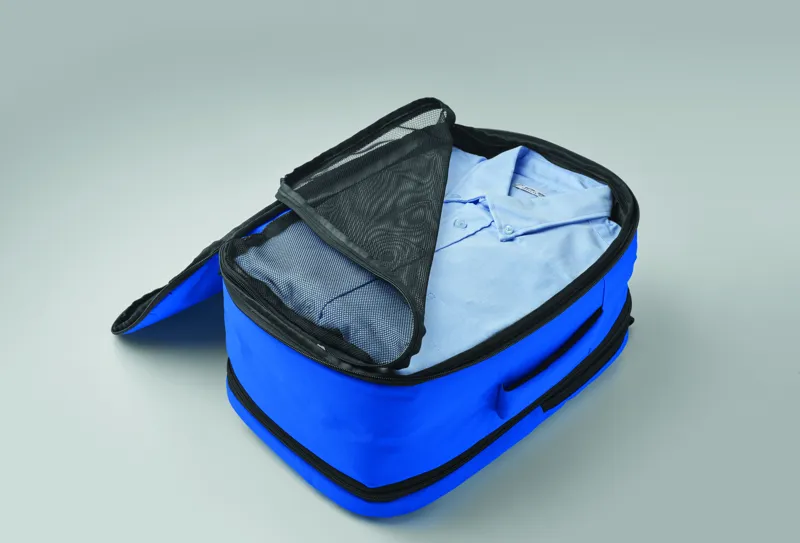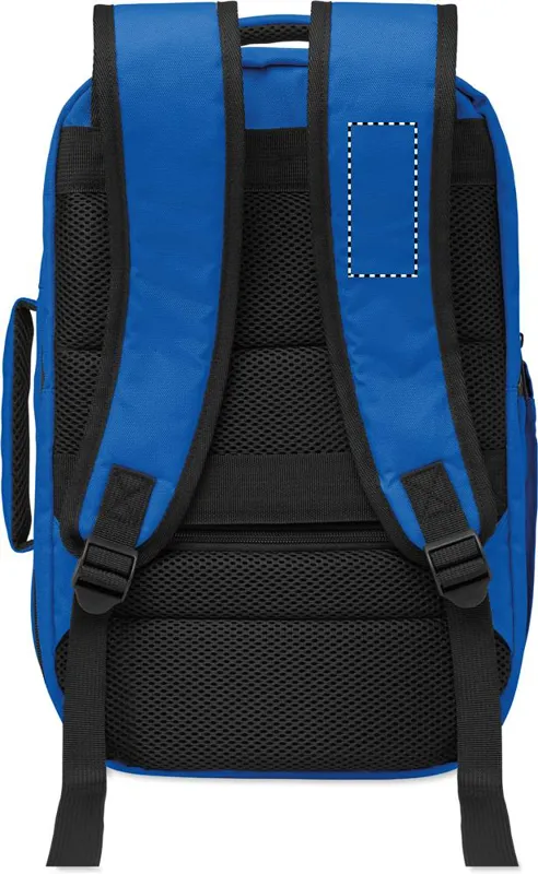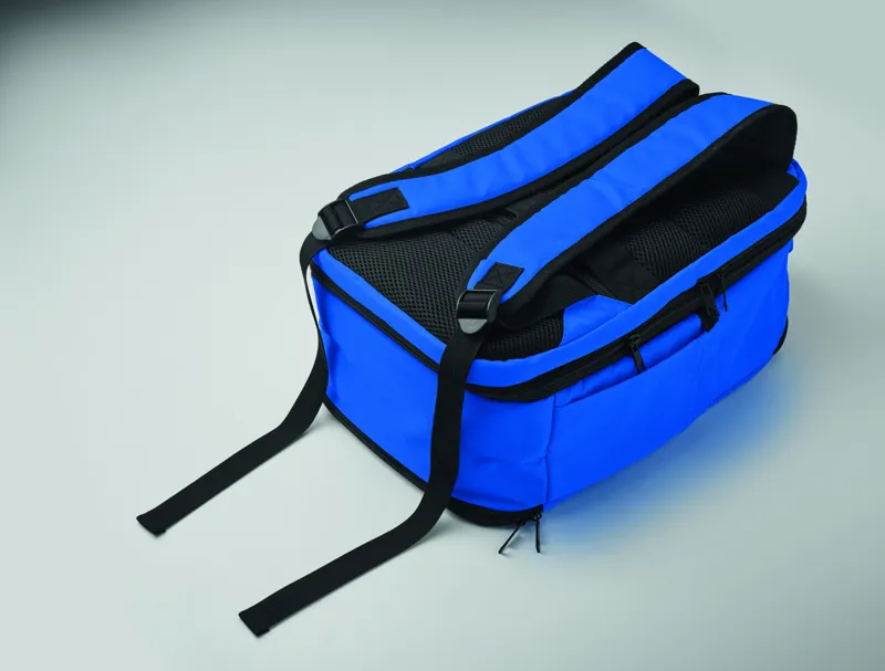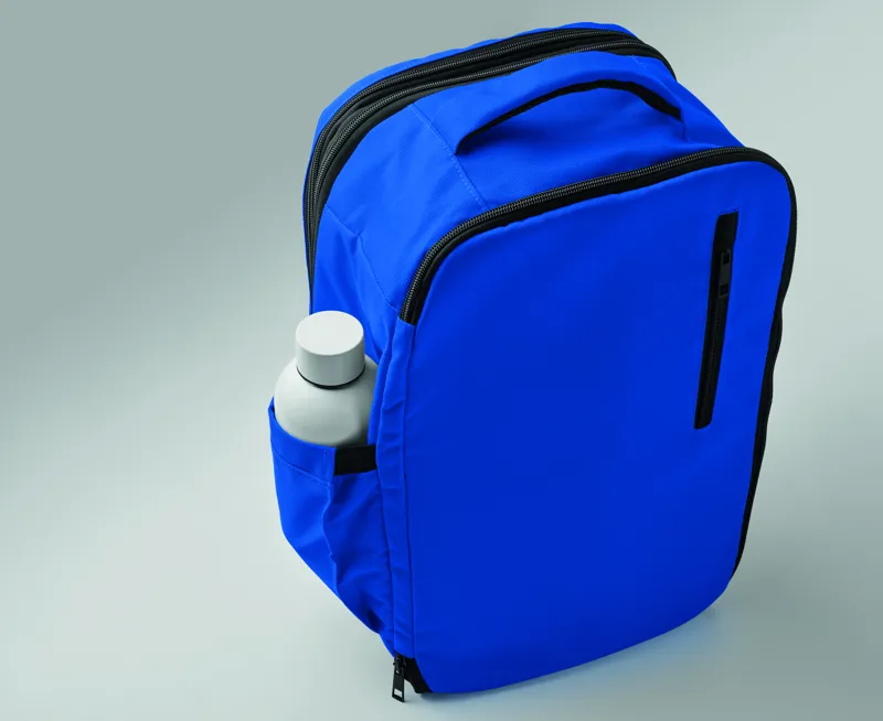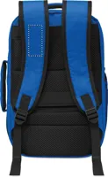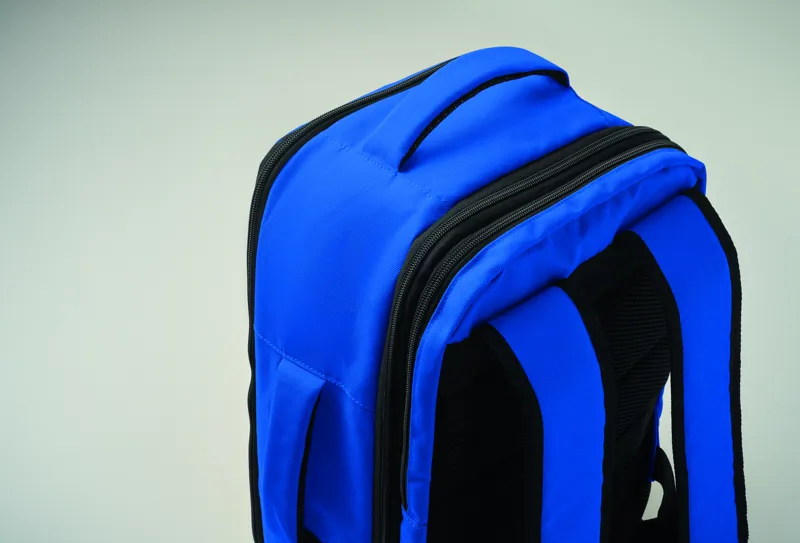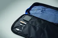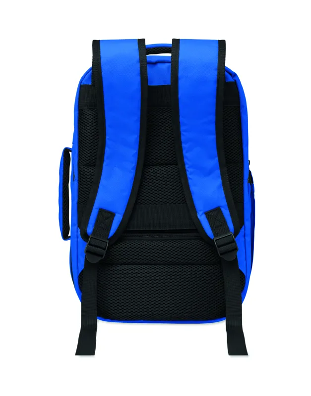 Kabinméretű, bővíthető hátizsák 600D RPET poliészterből, 180°-os nyitással. Fő rekesszel, két nyitott résszel, hálós elválasztóval, párnázott 15 colos laptop rekesszel és bőröndpánttal.