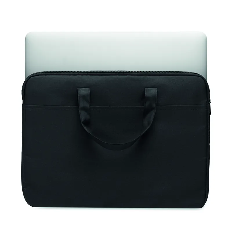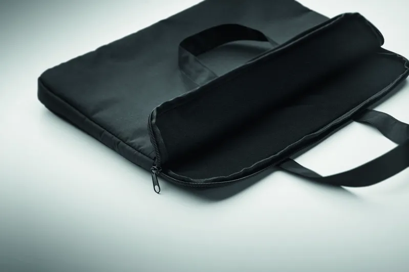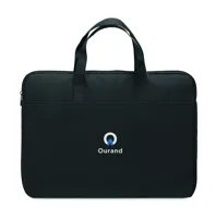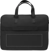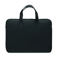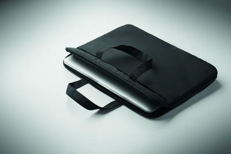 15 colos laptop táska 300D RPET poliészterből, rövid fülekkel és hátoldalán gurulós bőröndre illeszkedő pánttal.