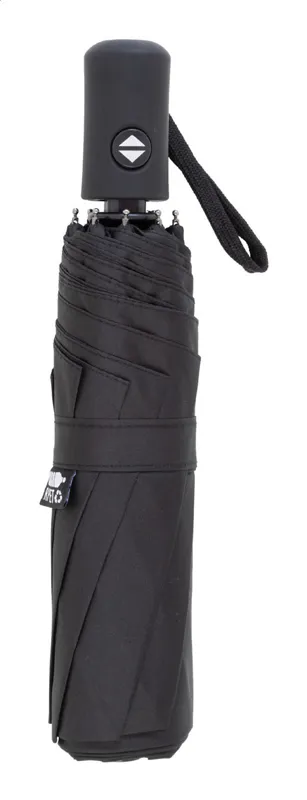 Teljesen automata (nyitás/zárás), szélálló, összecsukható esernyő 8 panellel, hozzáillő színű tasakban. Fém kerettel, üvegszálas bordákkal és gumírozott fogantyúval, kézi szíjjal. 190T RPET pongee. Megkülönböztető RPET címkével.