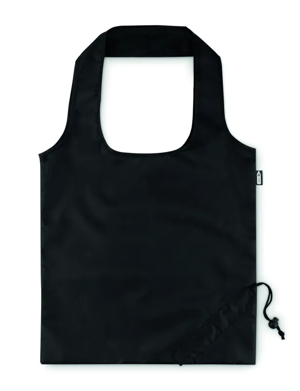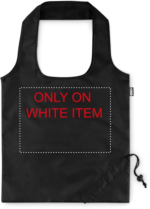 Összehajtható bevásárlótáska 190T RPET anyagból. A táska egyik sarkában kialakított praktikus húzózsinóros résznek köszönhetően kicsire összehúzható. A szublimációs nyomtatás csak a fehér színű terméken érhető el.