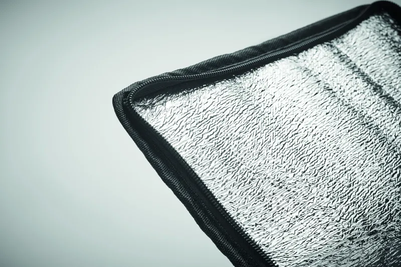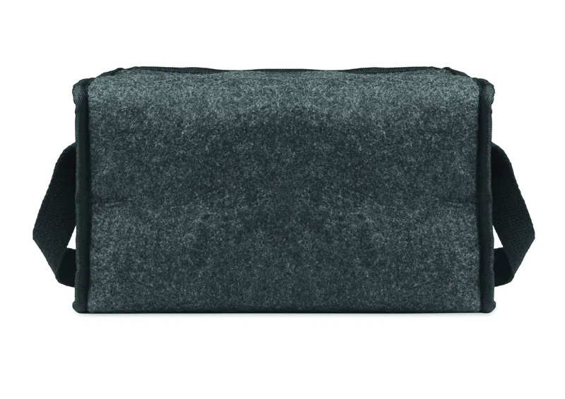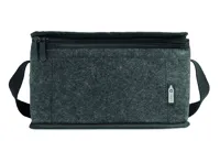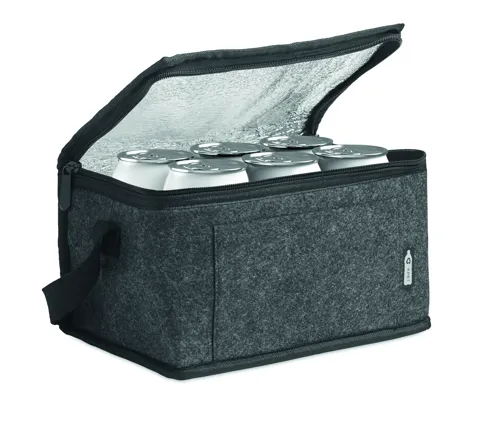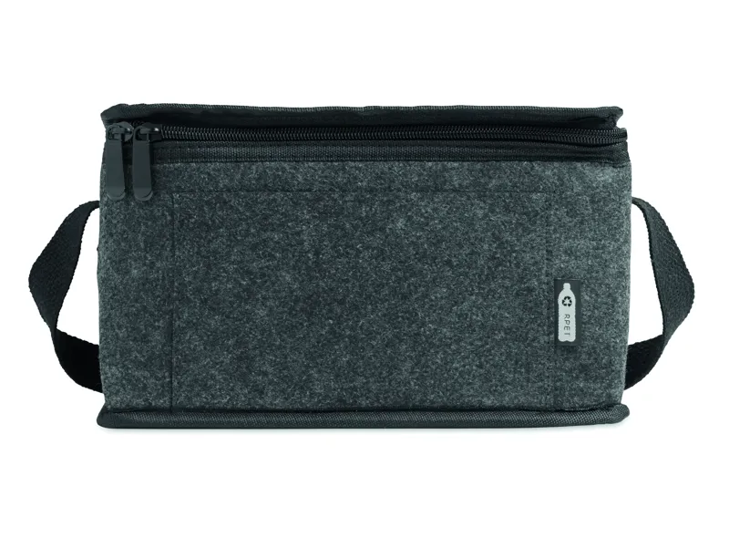 RPET filcből készült hűtőtáska elülső zsebbel. 1 mm vastag RPET filc és 3 mm vastag hőszigetelő laminált alumínium fólia. Kapacitás: 5 l.