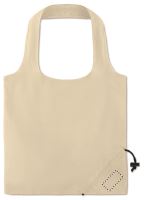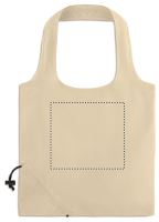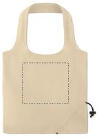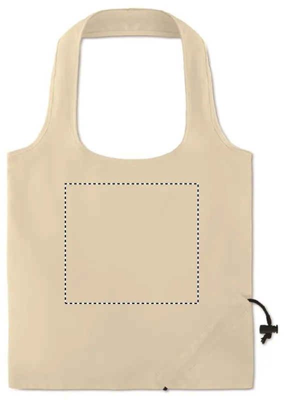 Összehajtható bevásárlótáska 105 g vastag pamut anyagból, rövid fülekkel. A táska egyik sarkában kialakított praktikus húzózsinóros résznek köszönhetően kicsire összehúzható.